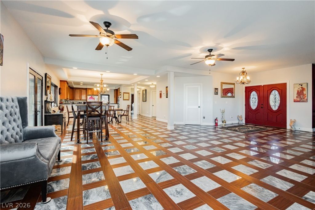 Set above the desert horizon in Boulder City's prestigious Lake Mead View Estates, this custom estate commands sweeping lake & mountain views 35 minutes from the Las Vegas Strip. Designed with exceptional craftsmanship and double energy-efficient construction. Interior includes Brazilian cherry hardwood floor accents, imported Italian marble, and custom cabinetry. Chef's kitchen features Viking refrigeration, double ovens, and gas cooktop island. Private backyard retreat offers putting greens and structured outdoor living spaces framed by panoramic views of Lake Mead. The property backs to 180 acres of hiking trails, creating a sense of openness and connection to the landscape. Six-car garage with SWISSTRAX flooring, Moduline cabinetry complements the home's three-level layout, with elevator access and spacious basement. Within a thoughtfully preserved, non-gaming community, this rare estate presents the opportunity to experience Las Vegas from a place of privacy, scale, and composure.