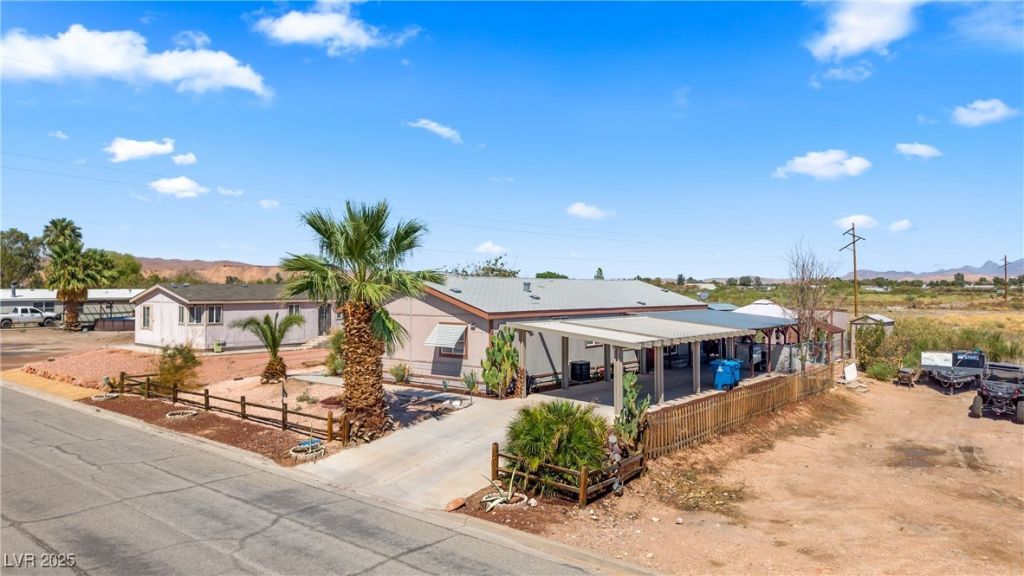 Charming converted manufactured home offering flexible living with the potential for 4 bedrooms. Cozy up in the spacious living room featuring a wood-burning stove ? perfect for cool desert evenings. Enjoy the convenience of a 3-car attached carport and take advantage of the expansive outdoor living space, including a gazebo ideal for relaxing or entertaining guests. The low-maintenance yard features rock and desert landscaping, providing beauty without the upkeep. Three sheds on the property offer ample storage and are included in the sale. Don't miss this versatile and inviting property!