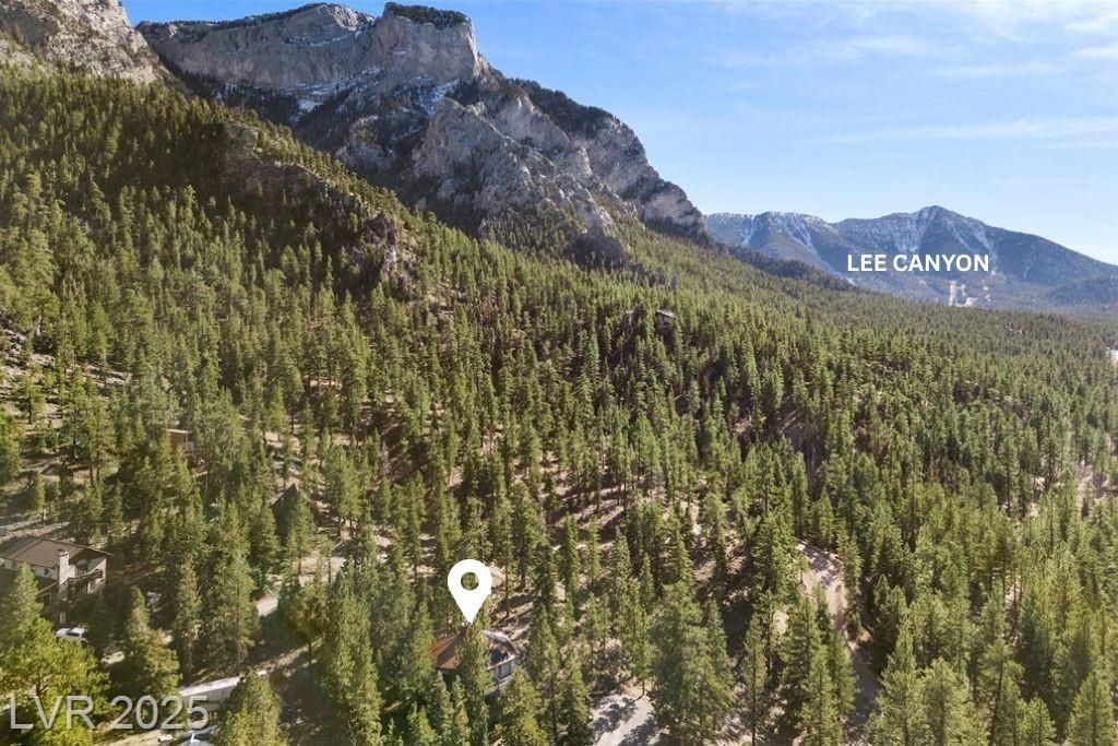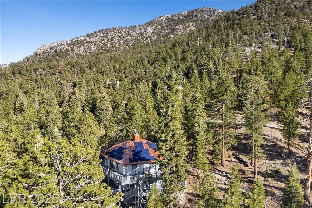 Enjoy mountain living in this unique log home on a peaceful .46-acre corner lot bordering U.S. Forest Service land. True treehouse feel, nestled in the pine trees w/BIG mtn views. Private + connected to the outdoors. Inside, the living room features vaulted ceilings + a Heritage Soapstone wood-burning stove, creating the perfect ambiance. Kitchen w/butcher block countertops, garden window, breakfast bar + stainless appliances. Primary bedroom opens to a wraparound deck w/sweeping forest vistas + fresh air. Downstairs features a massive family room w/fireplace + wraparound deck. Basement level w/ample storage + laundry. Standing seam copper roof + classic log construction. Off-the-grid + self-sufficient w/36 solar panels, Schneider inverter, T-105 lead-acid batteries, Generac propane generator, 1,000-gal propane tank, Daikin furnace, Rheem water heater, +1,700-gal underground water tank. Minutes from Lee Canyon! Toiyabe National Forest is your big, extended backyard! Elevation:8,006 ft