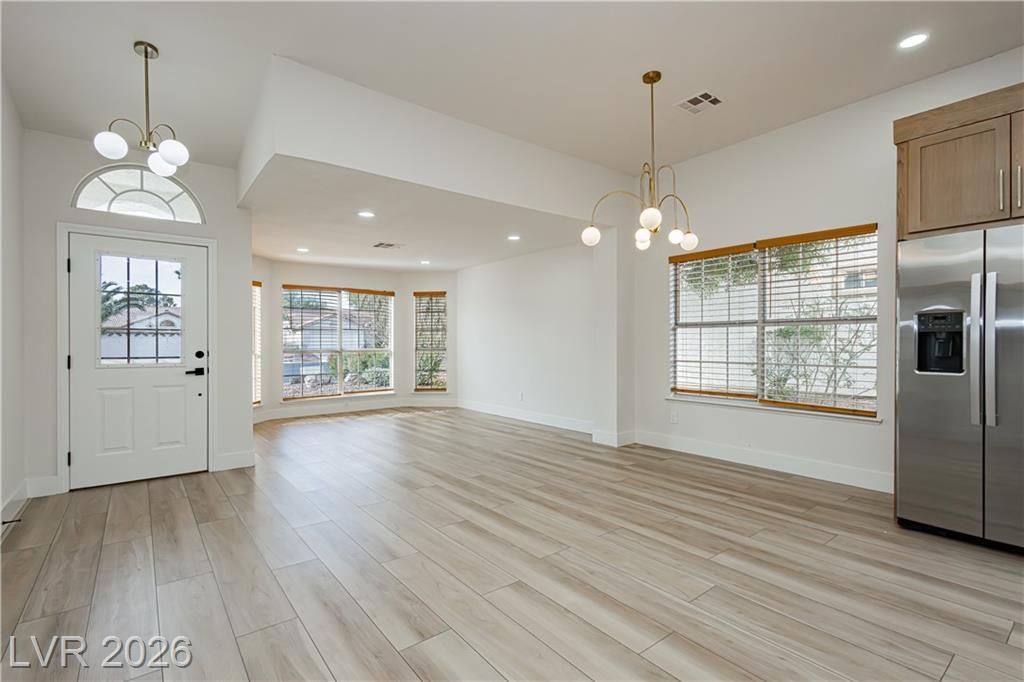 Welcome to this beautifully renovated home in the guard-gated community of Los Prados. The open-concept layout features a custom-tiled electric fireplace, a designer kitchen with a double waterfall-edge quartz island, two-toned soft-close shaker cabinets, and stainless steel appliances. Luxury vinyl flooring leads to a spa-inspired primary bathroom with a custom-tiled shower and freestanding soaking tub. The private backyard offers a covered patio, sparkling pool, and Japanese Blueberry trees for added privacy. Additional highlights include a new AC system, secured community RV parking, and access to an 18-hole golf course, clubhouse, 19th Hole Restaurant, tennis, pickleball, shuffleboard, and a 2.2-mile walking trail.