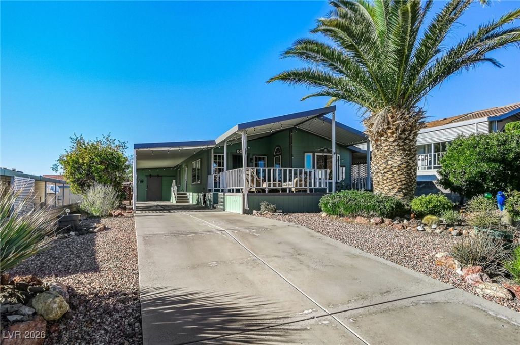Charming and versatile floor plan featuring beautiful hardwood floors and welcoming front and side porches. The updated kitchen delivers classic country charm with neutral painted cabinetry, and stylish hardware, opening seamlessly to a delightful nook and den?perfect for casual dining, home office or puzzle room. The remodeled primary bath is a true showstopper, highlighted by concrete countertops, a Kohler soaking tub, dual shower heads, and a convenient linen closet. Recent upgrades include a newer roof, skylights, air conditioning, and water heater, offering peace of mind and energy efficiency. Exterior amenities abound with two Lifetime sheds, a 40+ foot tandem carport, and an attached workshop?ideal for hobbies, storage, or projects. Enjoy community amenities including a clubhouse and pool/spa. RV or boat owner? Take advantage of the community's fenced, secure, and affordably priced RV/boat parking area in Boulder City's 55+ community!